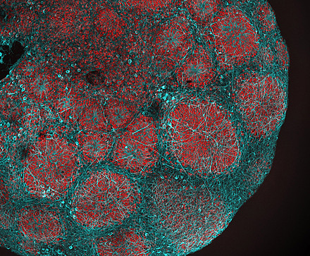 Pulling some methodological tricks: Based on brain organoids such as this one – i.e., three-dimensional replicas of the brain measuring only a few millimeters in diameter – the researchers tested the effect of sildenafil in the laboratory. The organoids were grown from patient stem cells, thereby mimicking the clinical picture of Leigh syndrome. Red: neural progenitor cells; blue: nerve cells. © HHU | Stephanie Le, Prigione lab