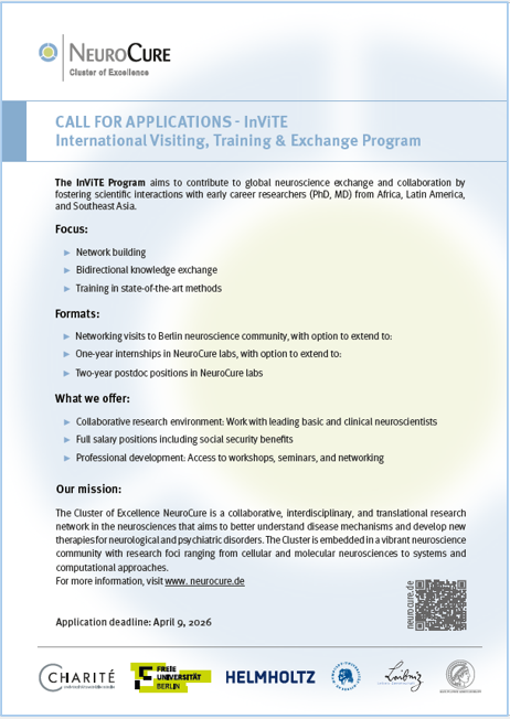 - Family-friendly & inclusive culture: NeuroCure is committed to fostering a family-friendly and inclusive work environment that welcomes researchers from all backgrounds, including underrepresented groups. The InViTE program will be supported by workshops on intercultural teamwork and collaboration for fellows and host lab members.