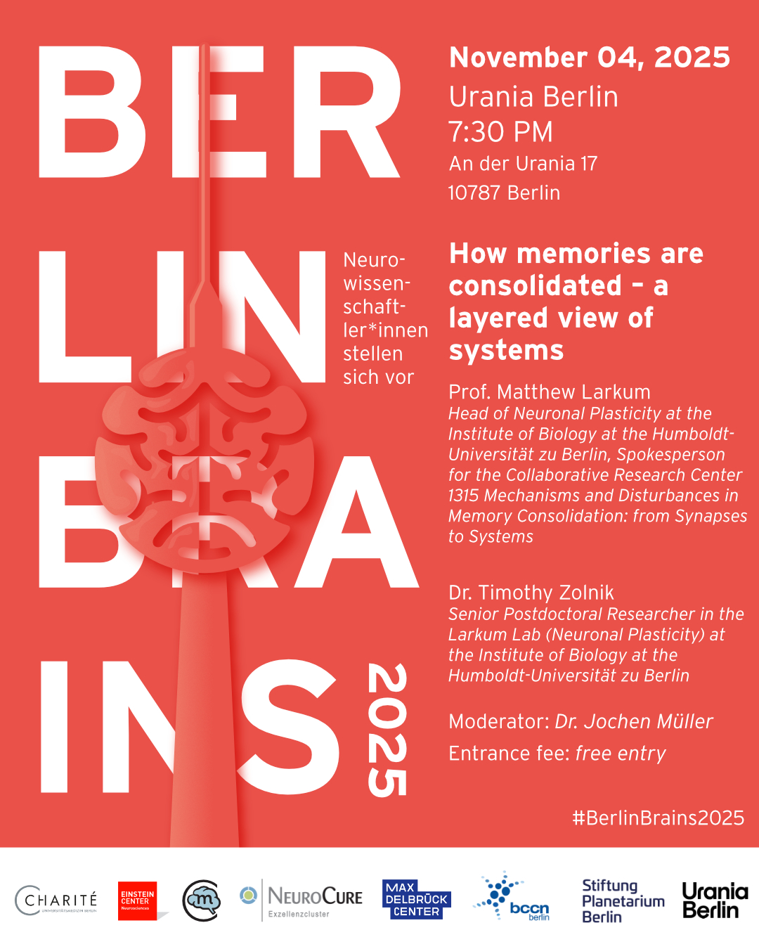 Berlin Brains ist eine gemeinsame Veranstaltungsreihe von Urania Berlin, Stiftung Planetarium Berlin, Bernstein Center for Computational Neuroscience Berlin, dem Exzellenzcluster NeuroCure und Science of Intelligence, dem Einstein Center for Neurosciences Berlin, dem Max-Delbrück-Centrum für Molekulare Medizin in der Helmholtz-Gemeinschaft sowie dem Sonderforschungsbereich (SFB) 1315.
